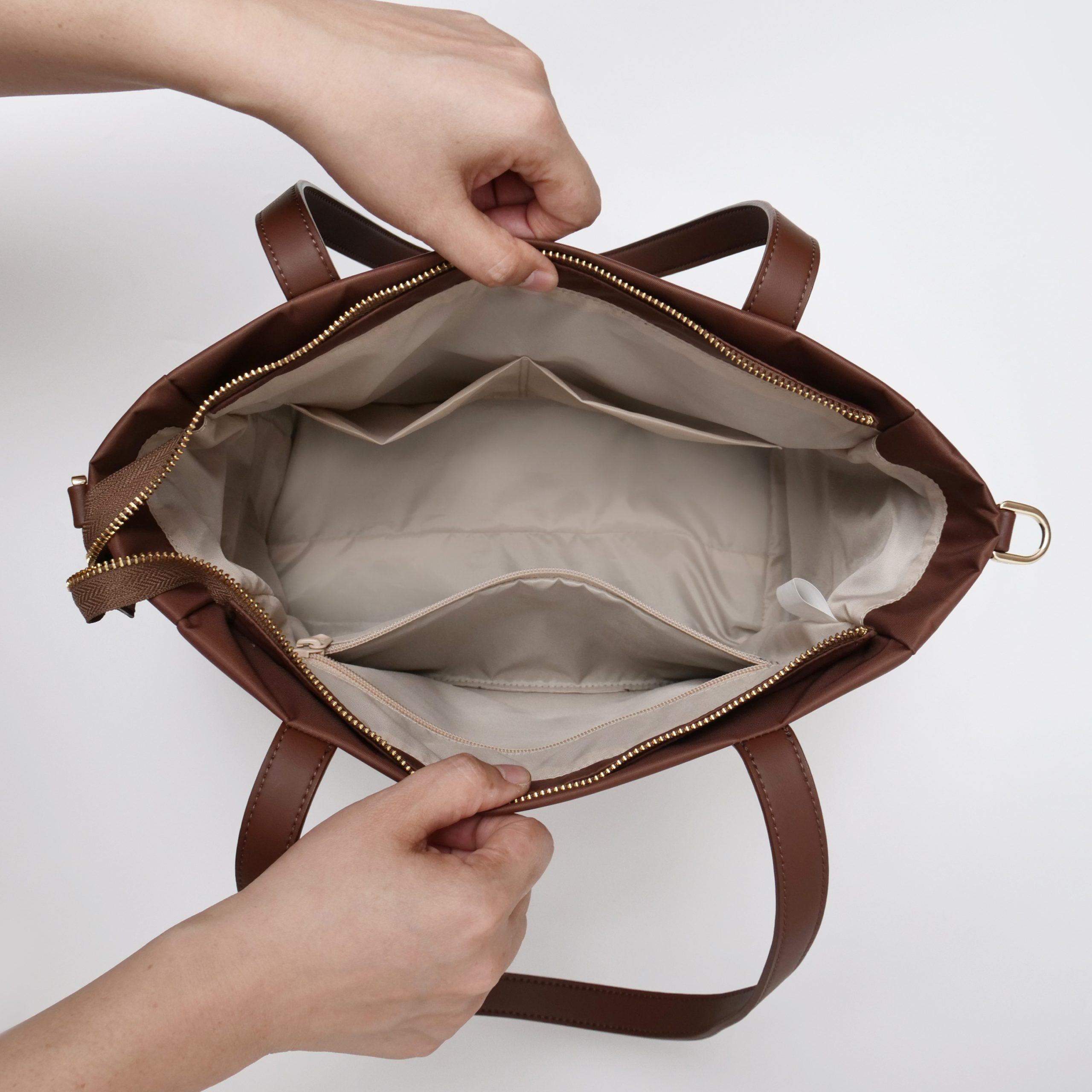 – Detil bagian dalam: 1 kantong besar dengan zipper dan 2 kantong kecil